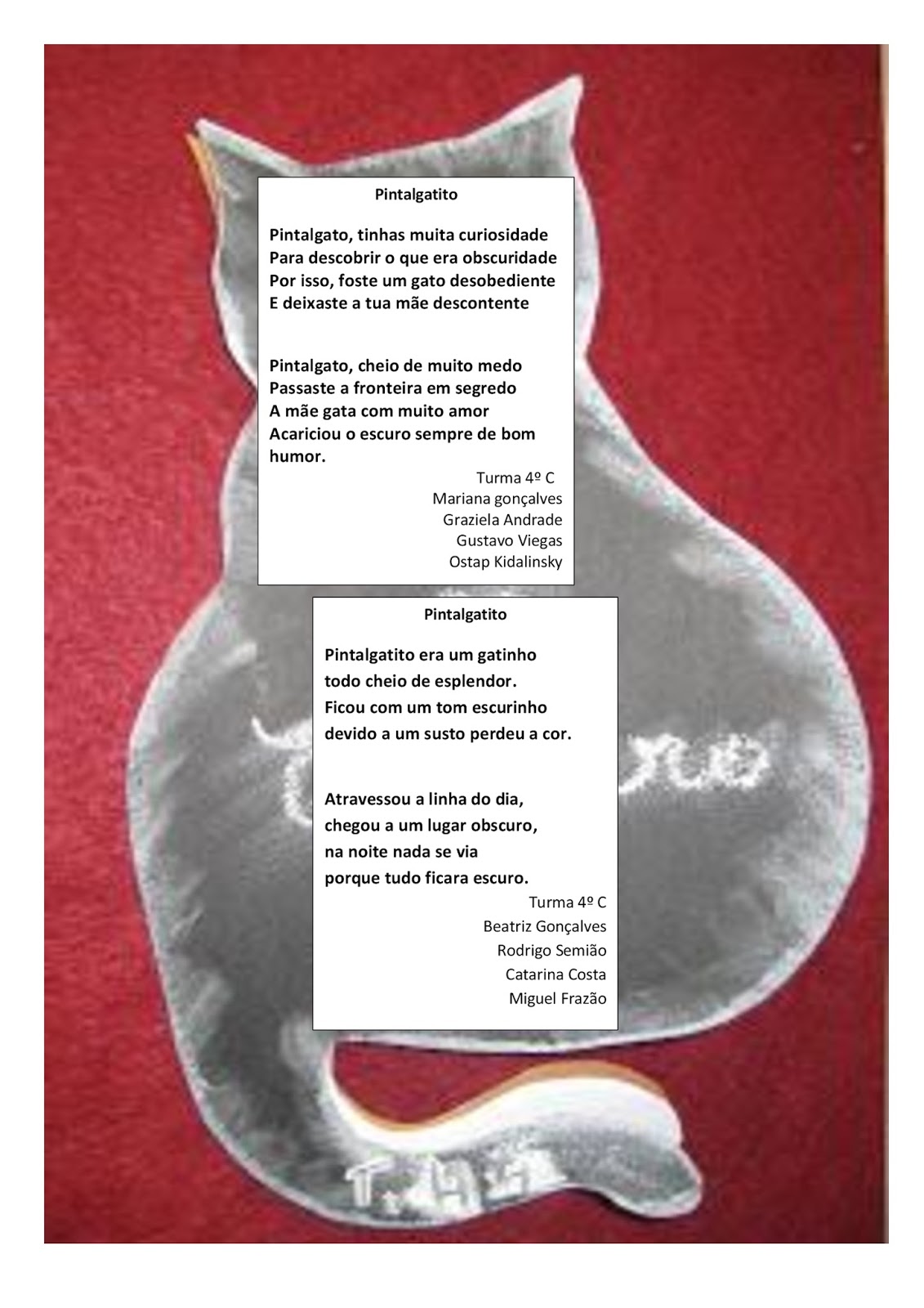 Boa produção literária!!! Os alunos do 4º C, depois de virem à biblioteca ouvir a história "O gato e o escuro" elaboraram, em grupo, estes poemas dedicados ao gatito da história. É para continuarem...queremos mais poemas!!!